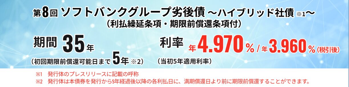 このソフトバンクグループ株式会社 第8回利払繰延条項・期限前償還条項付無担保社債は、「利率はかなり高めだが、そのぶん普通の社債より仕組みが複雑で、リスクも一段重い社債」です。私のように社債初心者にわかりやすく表現すると、「高い利息の理由は、普通社債より投資家が譲る条件が多いから」と理解するとわかりやすいです。